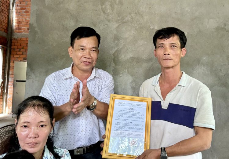 Ông Nguyễn Văn Sâm – Phó Chủ tịch UBND xã Phước Hiệp trao quyết định bàn giao nhà cho ông Tô Văn Út Bé