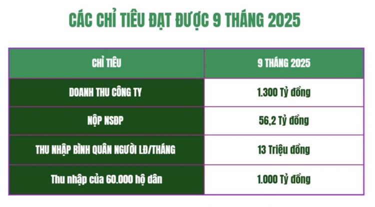 Chỉ trong 9 tháng đầu năm 2025, Công ty đạt doanh thu gần 1.300 tỷ đồng, giúp bà con nông dân thu về 1.000 tỷ đồng, nộp ngân sách trên 56 tỷ đồng, thu nhập bình quân hơn 13 triệu đồng/người/tháng, tạo việc làm ổn định cho hàng chục nghìn lao động gián tiếp.