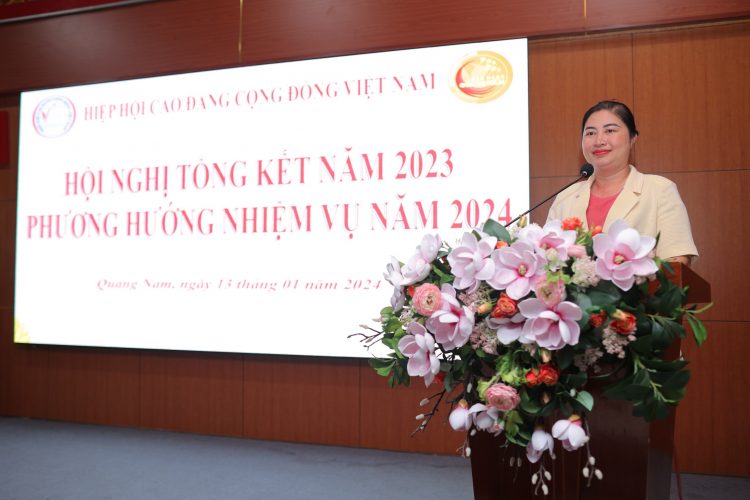 Phát biểu tại Hội nghị, PGS. TS. Vũ Thị Phương Anh – Bí thư Đảng uỷ, Hiệu trưởng trường Cao đẳng Quảng Nam tự hào chia sẻ: “Trường Cao đăng Quảng Nam là đơn vi đăng cai hội nghị lần này và vui mừng chào đón các thầy cô lãnh đạo Hiệp hôii và lãnh đạo các trường Đại học, Cao đằng, các doanh nghiệp là thành viên của Hiệp hội về tham dự. Trường được thành lập theo quyết định 359 của Bộ Lao động – Thương binh và xã hội và chính thức đi vào hoạt động trên cơ sở sáp nhập 6 trường từ ngày 1/6/2021… Đến nay Trường Cao đẳng Quảng Nam đã cơ bản ổn định về cơ cấu tổ chức đồng thời tập trung nâng cao chất lượng đào tạo, liên kết doanh nghiệp, đào tạo gắn với nhu cầu viêc làm, mở rộng trong hợp đào tạo Quốc tế, tặng cường liên kết tạo việc làm cho thị trường trong nước và các nước trong khi vực, đặc biệt là thị trường Nhật Bản, đây là thị trường là nhà trường đã có liên kết và đang phát triển. Tiếp đó, chú trọng xây dựng hoàn chỉnh chương trình đạt chuẩn, viết giáo trình, tăng cương liên kết với hiệp hội, với các trường trong nước và quốc tế để mở rộng hợp tác trong đào tạo, trong nghiên cứu khoa học, nâng cao trình độ về mọi mặt để đáp ứng yêu cầu đào tạo và đang  hoàn thiện đầy đủ các điều kiện để năm nay được kiểm định chất lượng cơ sở giáo dục và một số chương trình trọng điểm cũng như tạo tiền đề để trở thành trường chất lượng cao vào năm 2025…”
