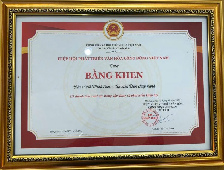 (CSPLO) – Ông Hồ Minh Sơn – Phó Chủ tịch Hiệp hội Phát triển văn hoá cộng đồng Việt Nam, Chủ tịch HĐKH – HĐQL Viện Nghiên cứu Chính sách pháp luật&Kinh tế hội nhập (IRLIE), Giám đốc Trung tâm tư vấn pháp luật Toàn Tâm (TTLCC) vinh dự nhận Bằng khen của Chủ tịch Hiệp hội Phát triển văn hoá cộng đồng Việt Nam vì đã có thành tích xuất sắc trong đóng góp trong xây dựng phát triển hiệp hội năm 2025.