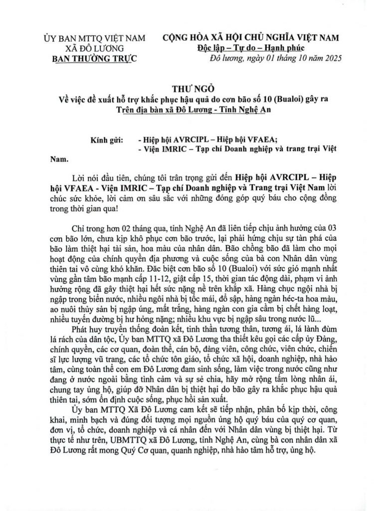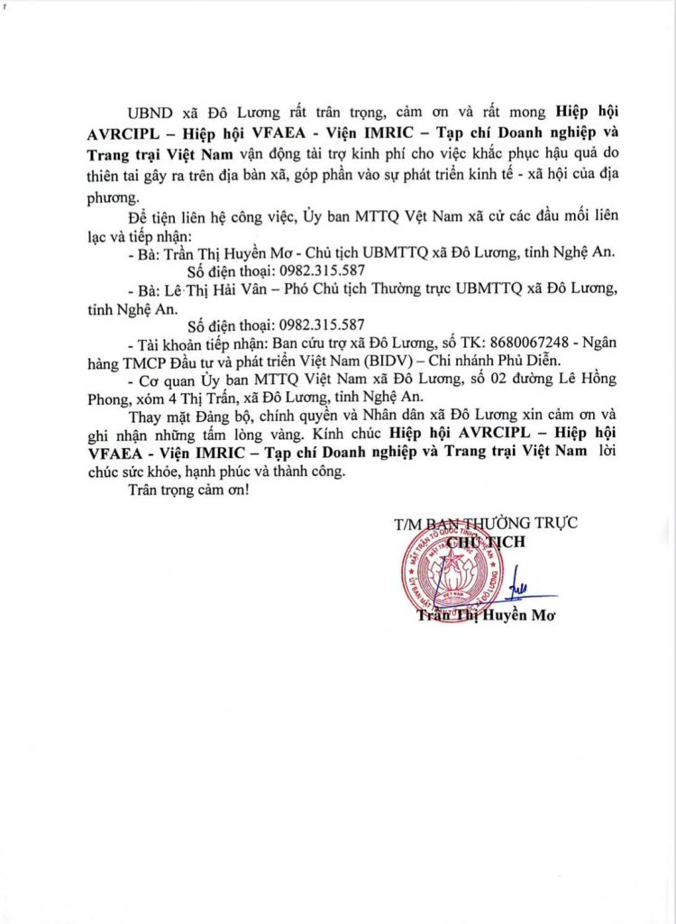 (CSPLO) – Tích cực hưởng ứng lời kêu gọi của Uỷ ban Mặt trận Tổ quốc Việt Nam xã Đô Lương (tỉnh Nghệ An), phát huy truyền thống đoàn kết quý báu với tinh thần “tương thân tương ái”, Hiệp hội Nghiên cứu, Tư vấn về Chính sách, pháp luật cho hoạt động đầu tư tại Việt Nam (AVRCIPL); Viện Nghiên cứu Thị trường – Truyền thông Quốc tế (IMRIC); Viện Nghiên cứu Chính sách pháp luật&Kinh tế hội nhập (IRLIE); Trung tâm tư vấn pháp luật Toàn Tâm (TTLCC) và Trung tâm tư vấn pháp luật Minh Sơn (TTTVPLMS) đã nhanh chóng phát động kêu gọi hội viên hiệp hội, các doanh nghiệp thành viên thuộc Câu lạc bộ doanh nhân IMRIC – IRLIE, Câu lạc bộ Báo chí Truyền thông&Chính sách pháp luật và cộng đồng doanh nghiệp đồng hành, các tổ chức xã hội bằng những sự sẻ chia, giúp đỡ về tinh thần, vật chất, góp phần hỗ trợ đồng bào khắc phục thiệt hại do bão số 10 gây ra.