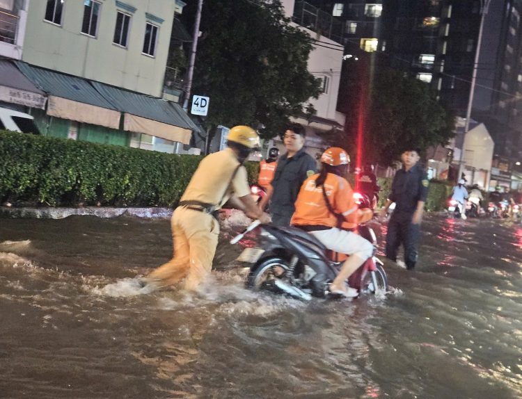 Theo đó, phát huy tinh thần “Vì nhân dân phục vụ”, lực lượng CSGT kịp thời có mặt, lội nước điều tiết giao thông, hỗ trợ phương tiện chết máy, giúp người dân thoát khỏi điểm ngập sâu. Điển hình, tại tuyến đường Huỳnh Tấn Phát, đoạn qua phường Phú Thuận và giao lộ Huỳnh Tấn Phát – Phú Thuận, mặt đường chìm trong biển nước. Đặc biệt, các chiến sĩ còn nỗ lực đẩy các phương tiện bị chết máy do ngập nước vào vị trí an toàn, giúp người dân sớm thoát khỏi vùng ngập.