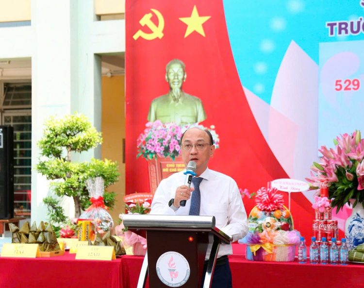 Thầy hiệu trưởng Đinh Quang Thanh Bình phát biểu ôn lại truyền thống nhà trường tại buổi lễ