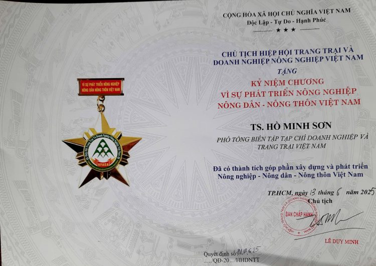 (CSPLO) – Với sự tham gia điều hành khối Văn phòng Hiệp hội Trang trại và Doanh nghiệp nông nghiệp Việt Nam (VFAEA), lèo lái Viện Nghiên cứu Thị trường – Truyền thông Quốc tế (IMRIM) và Viện Nghiên cứu Chính sách pháp luật và Kinh tế hội nhập (IRLIE) sự cống hiến không ngừng nghỉ và tình yêu nghề mãnh liệt góp phần vào tuyên truyền về ngành nông nghiệp trong việc phát triển của Tạp chí Doanh nghiệp và Trang trại Việt Nam (TC DN&TTVN), TS. Hồ Minh Sơn đã vinh dự được Chủ tịch Hiệp hội VFAE trao tặng Kỷ niệm chương vì sự phát triển “Nông nghiệp – Nông dân – Nông thôn Việt Nam” vào ngày 16/06/2025 mới đây.