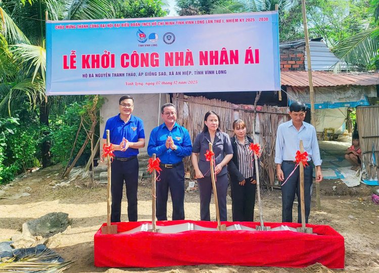 Đại diện BTV tỉnh Đoàn Vĩnh Long, Thường trực Đảng uỷ, UBND, UBMTTQVN xã An Hiệp cùng ông Hồ Minh Sơn thực hiện nghi thức khởi công căn nhà nhân ái.